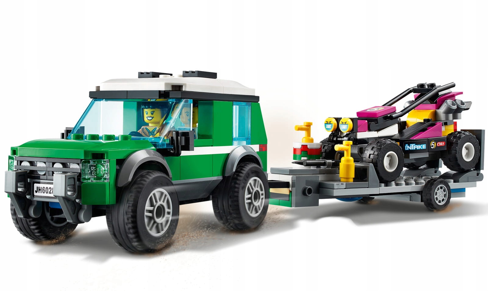 - Co jest w pudełku? Wszystko, czego dzieci potrzebują do zbudowania terenowego SUV-a z przyczepą, która ma rozkładane rampy i może przewieźć łazik Baja ze skręcanymi kołami. Są tam także fajne akcesoria i dwie minifigurki kierowców.