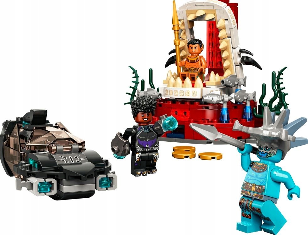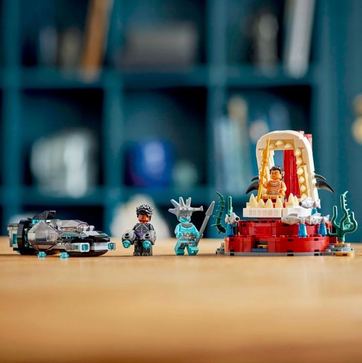 - Postacie Marvela — w komplecie minifigurki Shuri, Attumy i króla Namora. Złożona z klocków łódź podwodna i sala tronowa zawierają elementy w kształcie wodorostów i ryb