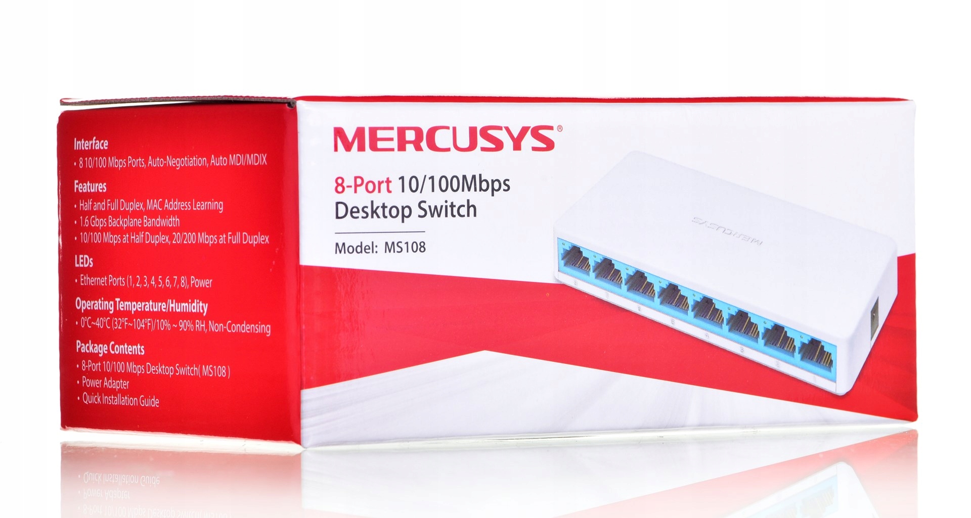 Switch MS108 firmy Mercusys jest idealnym rozwiązaniem zarówno dla właścicieli niewielkich firm, jak i dla użytkowników domowych. Wyposażony jest w 8 portów 10/100 Mb/s z automatyczną negocjacją szybkości połączeń. Zastosowanie prezentowanego przełącznika zapewnia łatwą rozbudowę sieci komputerowej, a to dzięki jego kompaktowym rozmiarom oraz instalacji Plug-and-Play oznaczającej brak konieczności konfiguracji.